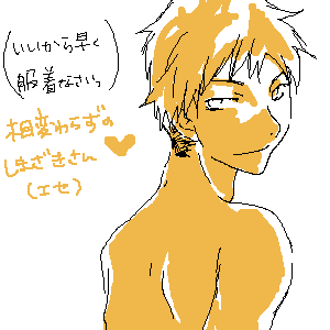 ・・・支えあって、というか背もたれにして、というか。 ということでッ 昴さん仙人掌さんから僭越ながら頂いてまいりましたっ。恥ずかしながら頂いてまいりましたっ。 一字バトン、だから人という字はー とか言ってたのに人という字が関係なかった件はスルーしてください・・・。 『一字バトン』 ●ルール 名前が出た管理人さんは必ず受け取ってください。 一度やった人はやらなくてOKです。 知っている人、または知り合いの管理人さんは必ずのせること。 「愛」:はつもん いろんな方から愛されてるお方なので。 「楽」:えーてん すっごい楽しいです、心得てると思います。 「麗」:すばるん トータルイメージだとここがベストです。 「癒」:さららん my不動の癒しなので勝手に癒されてます。 「優」:めぐるん がんばりやさんで優しい子だと思います。 「美」:さぼたん 言わずもがなー!!すげえですよすげえきれいですよ。 「柔」:ごーごん ふぁー としてそうなのでぱくっとしそうになります。 ●色 「赤」:榛/名 「蒼」:大地 「桃」:加/具/山さん 「白」:叶さん 「緑」:秋● 「藍」:呂/佳兄さん 「黄」:市/原さん 一見、しっちゃかめっちゃかですがしょっちゅう「桐/青/桐/青」言い過ぎたので反省の念を込めて単行本登場済みで目につく彼らを。意外性の意味で見所は叶さん。一生このブログで名前出るとは思ってなかったべ!? 私もです。 ●季節 「春」:口ックオン 「夏」:アレノレヤ 「秋」:ティ工さん 「冬」:せっちゃん 全部口ックオンでいいんじゃないかな と思ったものの自分勝手するのはやめました。カテゴリーとしては丁度4人なのでマイ★スタァな彼らで行ってみました。 夏の彼は、だって、その、 格 好 が 。 (心なしか邪険にされがちな気がするスミマセン)(それもまあ愛) 漢字一文字ってダイレクトだからかなり私が抱いてるイメージがバレちった感がムキムキします。大丈夫かしら・・・。 *** すばるんパスありがとうですー!そうなのです、蒸した肉まんのような柔らかさ、それが私ですイェア!! さぼたんもありがとうですー!そうなのです、人生楽なほう楽なほうに流されがちですエヘヘへへ★ バトン、普段使わない脳の部分を使ってるような気がします。1バトンで1ヶ月くらい脳年齢が若返れそうなコレは錯覚かしら希望かしら。 何考えてこうなったんだろう・・・と思わせがちなバトンの受け取りっぷりでしたが、あの、またよかったらやらせてくださいませ(にこにこ)! 2008.06.04 Wed 00:57:56