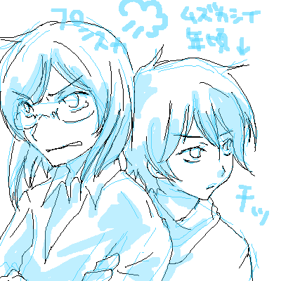 うそつけ。 ていうか何があった・・・。いや、あの、ぷんすかさせたかっただけです・・・。思春期で難しい息子と手を焼くママンともうすぐ仕事から帰ってくるパパ・・・。この場合パパは、・・・・・・。え? まあ誰でもいいんだけども(一切の方向性を見失ってるのでそっとしておいて・・・)。突発的だったから深くなんにも考えなかったYO。(一時的に)仲悪そうでも怒っててもすきです。みんなすきです。イアンとかもちょうすきです。 ところで初描きせっちゃん。資料なんてどこにもない。きっとこんな子じゃない。 記憶だけが頼りです。大した記憶力ないのに、今自分の脳のキャパシティの8割方、彼らや彼らのためにメモリーを使ってます。残り2割で一般生活を送ってますので如何せん、足りない感じなので思い出せないことがいっぱいあるのです。 愛も変わらず、いや相も変わらず振りヵゝぶったり0*0だったり お・・・おたくってたのしいなあ!! *** 4時間後に起きて仕事、か・・・。早く寝ればいいのにね・・・。 ていうか寒くて眠れない!そして明日が来たら来たでいろいろやらねばならないことを処理しなきゃなので寝るの怖いブルブル・・・! 2008.06.03 Tue 22:39:51