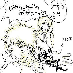 まあもう一度言う。 そもそも、名前がイイ・・・っ。裕/史て。裕/史て! 「高/瀬」の響きのかっこよさや「利/央」のナウでヤングな感じもだいすきだけども 本 と 山 て ・・・ !(悶絶) (時々自分でも悶絶のしどころがわからない) 本/山っていうざっくりした苗字萌え。 (時々自分でも萌えどころが以下略) ついでに、山/ノ/井さんの苗字の単純さと、圭/輔の画数の多さのギャップも萌え。これがうわさのギャップ萌え(違)。まあ、アレだ、平たく言うと 愛は盲目、みたいな。8巻の表紙でそうとうやられてから久しいですね・・・(遠い目)。 前も言ったけど、「ま」のつく子多いのよね桐/青っ/子。特に深い意味はないんだろうけど。ちなみに崎/玉(初めてここで名前出た・・・)の子、大/地とか豊、とか何だか五穀豊穣をイメージします。勝手に。崎/玉っていやぁあの糸目が気にならないといったらうそになるけども、マイベスト糸目は山/ノ/井さんただ一人です。ナンバーワンでオンリーワン・・・。 *** 明日猛烈に忘れ物しそう。 マスクしたまま仕事する日々だったのですっかり色々油断してる自分に気づいた。私、マスクデイズ、口をぽけーっとあけるクセついてる(ばくしょう)。ついでにマスクの下でニヨニヨしたり顔の筋肉の体操をしてたので、うっかり外したら、マスクしてるかのごとく薄ら笑ってたり口あけてたりしないか自分が心配。自信ないよ・・・。 毛先がQ ってフレーズ分かる方いるかなぁ。今私の髪の毛、毛先がQなんじゃないかってくらい傷んでる・・・どうしよう、ウジウジ。 2008.04.14 Mon 23:48:37