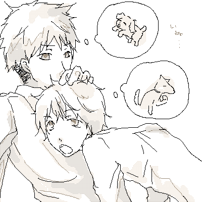 4月だし18日だし。 先輩と後輩です。何となく犬っぽいなぁと思い合ってたらオモシロイ。ああちっこい犬にしちゃったけど利/央はゴールデンレトリーバーかしら。なんとなく。「わふっ!」って感じが。 ま、能書き垂れましたが、桐/青の子らは誰と誰であろうとも仲良しこよしいちゃこらし であれば大満足です。げへへ。4月は慎/吾/さ/んおいしーねよかったねー。普段かっこいいと認めつつも鼻*鼻言ってるもんね。愛としか思えないねっ★ *** 猛荒れなお天気の中お仕事関係で日本の玄関に行ってたら久しぶりに、偶然先輩に会ったー!プライベートだったみたいで浮かれてたらしく 「おぁっ!えつこ久しぶり!よりいっそう丸くなったな!いよいよ谷に移住でもすんのか?」 浮かれてたんだよね。 「いっやー、昔はパンッパンな感じだったけど最早、ちょっと大人としてどうよ?ぽにゃ って音しそうだぞ」 浮かれてたんだよね。 浮き足立って月まで飛んでいってしまえ、と思った・・・(でもその先輩はすきです)。 S0Y J0Yのスットロベリーに勢いよくハマってしまった。 なんとなくこういう栄養補助食品的な物が苦手だったんだけど、コンビニで何も買わずに出てくることができなくて何となく買ったらおいしい、と思いました(作文)。そんなわけで、箱買いしました。自分は「ちょっと気に入ると箱買いする」というクセがあることにうすうす気づいてたんだけども、あの、あの、ご、ごめんなさい・・・。こういうのって無駄遣いなのかしら。普通に考えてS0Y J0Yに5、6千円出すかって言われたら・・・ハハハ(乾)。 あの、でも、スットロベリー、いろいろ出来がいいと・・・思ったのでしたぁ。今日のわ/ん/こなのでしたぁ。 2008.04.17 Thu 00:56:30