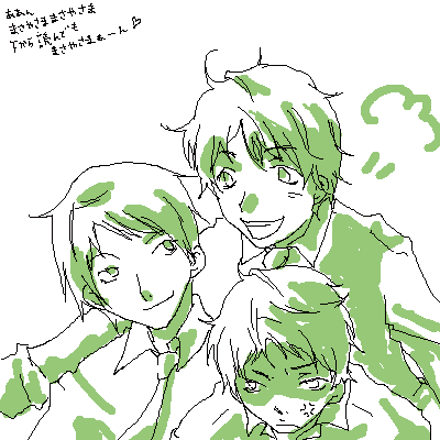 若干準/太/さ/んがイヤそうに見えるのは仕様です。 うそですv こんな後輩居たらさぞかし可愛かろう、と思いすぎたらピンクになった・・・。しっぱいしっぱい★可愛かろう、と思いつつもやはり準/太/さ/んはずっごく難しいのですよー。女々しくしたくないがしかし1ミクロンも可愛げが無いなんてそんなヴァカな!ヴァカなぁぁッ!! と思いながら描いてるとどっちかに偏ってしまうような。 こ・・・この不安定な感じが思春期か!そうなのか二次成長期!!違うよね。 そんで垂れ目ってぇのが難しいんだよ らっしゃい。慎/吾/さ/んはもう垂らしたらいいのか釣ったらいいのか分からないけども、とりあえずやらしくしたいけどどうしたらいいのか分からないの・・・!すきだけど、すきだからこそ分からないのあなたのこと・・・! よって、ネタ要員に回されたりすることが多いのであった。ごめんね。 *** 公約通りちょうまったりした1日を過ごしてもうた。 でもまあ大物洗濯したりドライカレー作って食べたりしてた。あー甘いもの食べたいよぅ。誰かパッと持ってきてくれないかな。チョコ食べたいなぁ。買っておけばよかった。 あ、植木鉢を3個飼ってるんだけども、ベランダで日向ぼっこさせててその横でシーツ干してたのですよ。 飼い主(私)はベランダを視界に入れつつ部屋で洋服整理してたら 「おー・・・ちょいと風吹いてるのかぁウフフ春風さんったらいたずらっ子ね。 シーツがはためいてさながらキラキラ光る小川みたいだわ!そろそろ土筆とかいてツクシと読むあの植物が生えてくるかしら・・・。何て楽しみなのッ!」 と脳みそのユージーン的部分(08年1月8日参照)を使ってたら 「あらあら春風さん!そんなにみんなとじゃれあってたらシーツで植木鉢が叩かれちゃったりしてー・・・ってほらねー!!ブフーッ!なななななな!」 落ちた。植木鉢さんが。シーツさんにあおられて。ベランダ側は広くなってて、めったに人が居ないものの焦りますぁなぁ。さっきまで「春風たんvvv」とか言ってたくせに、「あほか強風めがぁぁぁっ!」と慄きながらけが人および器物損壊の皆無を確認。よかった、大丈夫だったと一安心して回収。芝生だったからか鉢も壊れてなかったー。人居ないからって気をつけなきゃ・・・。普段はベランダの手前に出してたんだけどなぜか奥に置いてたから、やはり手前がいいのね、と思い知った・・・。 ドライカレーにチーズ乗せてオーブンにかけるとおいしいのな!(平静を装う締めくくり) 2008.03.23 Sun 01:43:33