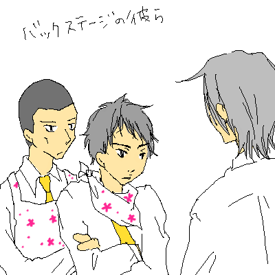 下で散々準/太/さ/ん女王様扱いしてますが 「さぞいやらしく恵方巻を食べるであろうと(慎/吾と利/央に)期待されてるだろうけどそうは問屋が卸さねえぜ!雄々しく食ってやる! と気合を入れて食べる準/太と 期待外れたけどそんな彼もすきな利/央と 同じくなんだけど因縁つけられて豆をぶつけられる慎/吾と 鼻に鬼が居ることに許せないため全力で本人のために豆をぶつけまくる山/ノ/井と まったく同意で投げる豆を甲斐甲斐しくポジショニングする本/山と とりあえず食に貪欲な前/チ/ンと 豆があたらないところで四季のイベントを肌で感じる松/永であった。」 (敬称略) をすごい勢いで描いた。 恵方巻は無言で食べきらなきゃなのに勢い余ったエースの台詞は「そうは問屋が卸さないぜ!!」です。 あ、こんなんだけど桐/青っこラブ。 もっと描きたかったけど落書きだしいっかーって。一応3年生優先で。和/さ/んは・・・割烹着でみんなのために豆でも炒ってると思って・・・。 こんなところで私信はごーごん! 僻地にヨウコソ・・・プルプル! 干し芋は・・・2キロ来ました。一体どうしたらいいのか自分でも良く分からなくなってます。 ・・・いる?(いらねエェ!!) ちゃんとなるべく美人になるように気をつけて誕生日を描いたものの すぐに今日株を落としてしまいます。トホホ。 *** 昨日はそもそも、準/太/さ/んの誕生日なので合コンは断ったのですが ウッカリ彼氏の誕生日祝いを忘れそうだったので急遽そっちをしてきた。 ひぃひぃ。 雨が夜更けすぎに雪へと変わるであろう状態を見れて山/下/達/郎化してます。 寒いよー出かけたくないよー。明日の朝はきっとアイスがバーンしてアイスバーンですよ。 いやぁ、運転・・・どうしよう・・・。 「できっぞ!」 に素直に「おお」と答えられない私がいます。無理なときは無理って言ったほうがいいのかい? すべるーすべるよー! 2008.02.01 Fri 01:54:36