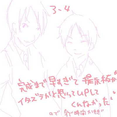 ・・・しっかし。あ、ちなみに彼は島/崎/家の次男坊だと思うのですがさ。 彼を描く時・・・異様に上に何も来ていない率が高いと 今さっき気づいた。なんでだ。なんでそんな脱ぐ。どっかの3-4とかちょう畏れ多くて脱がs・・・ととととんでもない!!!! ヒィアアア(顔覆)! でも人様のなら見る!指の間からじっくり見るよね! 島/崎/さんの前だと、何か恥じらい的なものが・・・なくなるんだ。 なんだろ、いやらしいものを目の前にしてそこで敢えて恥ずかしくなるのがもう恥ずかしいみたいな。いかがわしさの前では恥の文化が木っ端ミジンコなのよ。違って? *** 皆さん・・・武田さん(仮名)と会えた、よーーー!ひしっ! やっとこさエネループ来た。まさかの衝動買い。ずっと欲しかったんだけどねー。 仕事のストレス買いの割にはいい買い物をした。ような。 今日は今日とてとてちてた。 今日はぁーあ、鬼のような原稿(趣味の活動ではありません。文字です、そしてシンポジウムの原稿です)を書きますよ。きっと書きますよ。やればれきるよ、噛んだ、やればできるよ。 とりあえず手書きしてからパソコンで打ち直すんだけどまたこれが。面倒なのなー。 一発パソコン書きできたらちょっと早いのかとも思うんだけど推敲とかするには 手書きじゃないとすごく正しく見えちゃうの。 そんなわけでチタナイ字で、そして筆圧が低いのでボォールペンで書きます。果てしなく書きます。書いてる間は音楽とか聴けない、不器用な人間です。自分・・・ぶ、不器用っすから・・・。 gl○veの、Joy t○ the loveがどうしても歌いだしを 上下すーるヅラー!!と歌ってしまいます。仲間いねがー(なまHAGE)。 2008.01.27 Sun 23:54:17