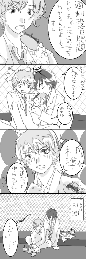 BLについて語っちゃうよ。 私がこういう世界に嵌った、んー、抜け出れらないわけじゃないけど 居心地良く感じるのはなぜか。 当然、(OきくFかぶってを前提に話すと) ①キャラクターが魅力的過ぎる、すきすぎる→その世界ですきなキャラクター同士で仲良しこよししてたらすごくイイ!!と思う ②先にその世界で絵や文を作る方の作品をすきになってしまった→話や登場人物がすき!と思える はある。 んだけどもしかしたら 自分は恋愛とかに関わりたくないという気持ちから自分、を女性に大きく置き換えて 女性(自らの象徴)の入らない世界で恋愛事は起きていて欲しいと思ってるんじゃなかろうかと。 そんなわけで明日5時起きですが絶賛桐で青にもゆもゆ中。 *** 以下全然面白くない話題なので。 2007.11.17 Sat 14:42:44