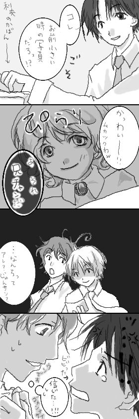 意味なく着替えシーンだったりする。 でも 言ってることはアホ。アフォー。 でもよく行くところの駅のホームに看板が出てた気がするんだよね。 写メ撮っとけばよかったっ。 看板にはご丁寧にカモシカの絵が描いてあったと思うの。 なんで私が言うと嘘っぽく聞こえるんだろーか。誠心誠意の人間なのに。 実直という言葉が似合うのに。なぁ? 利央はさぁ、理不尽にかまわれるといい。かまわれまくるんだ。 みんな利央やさしいの知ってるから構うんじゃないかしら。 そんで、絡みたい後輩だからいじっちゃうんだよねウンウン。 自分もアホーンなので投影しやすくてつい利央描いてるのかと思うんだけど、 一応大義名分、てのがあって、 こちらはじめダメ4コマ小噺3連作(そんなあるのか)をお世話になりまくった各所様へ 放り投げた、といういわくつき。 なんたる度胸よのぅ・・・ふぉふぉふぉ。 *** ヒーヒー。 朝もはよからオペレーションこなして、マックスしんどいのは終わったぞー。 チームワーク大事。 とりあえず一段楽したのでソファーでえびぞりながらちょっと気ぃ失って引き続きがんばる。 同期の結婚式が意外と近づいてて、あと2週間で如何に 美容院に行き ネイル行き ピン札おろし 溜まりまくった仕事をし 靴を履きならし 披露宴用のワンピに合わせるネックレス買い 溜まりまくった仕事をし 飲み会2回をこなし シンポジウムに参加し 溜まりまくった仕事をし 火災報知機付け替え ガスの点検に来てもらい 溜まりまくった仕事をし コタツ・暖房器具を出し 配水管清掃に来てもらうかが 問題だ。 ていうか 仕事貯めすぎだw ウワー2週間て、ウワー(錯乱)!! 2007.11.12 Mon 21:07:31