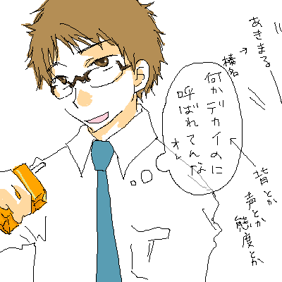 手を差し出す先にはたぶん、本/山さんかななんて。視点高そうだし。同時に手ぇ出されて「どっちを選ぶのッ!!」て詰め寄られて、えーどっちでもいいじゃんみたいになって「アタシよねっ、裕/司、アタシを選ぶわよねッ!」って若干きもちわるぅい感じになっちゃってるから仕方ないから両手で二人を同時にぐいーっと引っ張り起こすんだよねタッパあるから支店と作用点が遠くて何とか二人くらい引っ張れちゃうんだな みたいな。な。でも不意に自力で立とうとする山/ノ/井さんのせいでひっくり返っちゃったりね。ね。 以上、脳内妄想モードでお届けいたしました。 友情っていいよNE★とてつもなく慎/吾/さんが似てなくてどうしたらいいのかしら。。な、慣れ・・・? *** ふー、先週の金曜から片方の仕事がお休みなのでめっちゃゆっくりしてました。けどほとんど相方と一緒だったためパソコン触れないわオ夕クできないわジレンマもあるわけで。 今日から二本立て再開。ああもう早く終われー。 朝からカボチャホットケーキと、余った卵と牛乳でフレンチトースト作ったもののどっちから食べたらいいのかわけわからなくなって両方中途半端に食べちゃった。ホットケーキは保存できたのに・・・。 それだけ甘いもの食べたので今は某社からいただいたコンソメスープを飲んで中和。 こ、今週末は神戸日帰りの出張だけど、絶対に絶対に、パンツスーツが入らないと思われます隊長。 丸2日で何とかなるとも思えないです隊長。 PR 2008.11.04 Tue 20:52:10